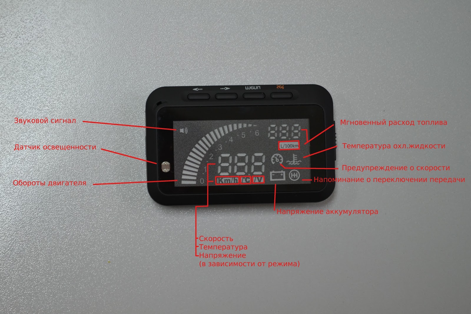 На коробке и на сайте продавца фото устройства с разноцветными светодиодами. Мой экземпляр светит только зеленым цветом и только крайние сегменты на индикаторе оборотов красные. То ли маркетинговый ход, то ли чтобы не отвлекать внимание водителя "елочной гирляндой".