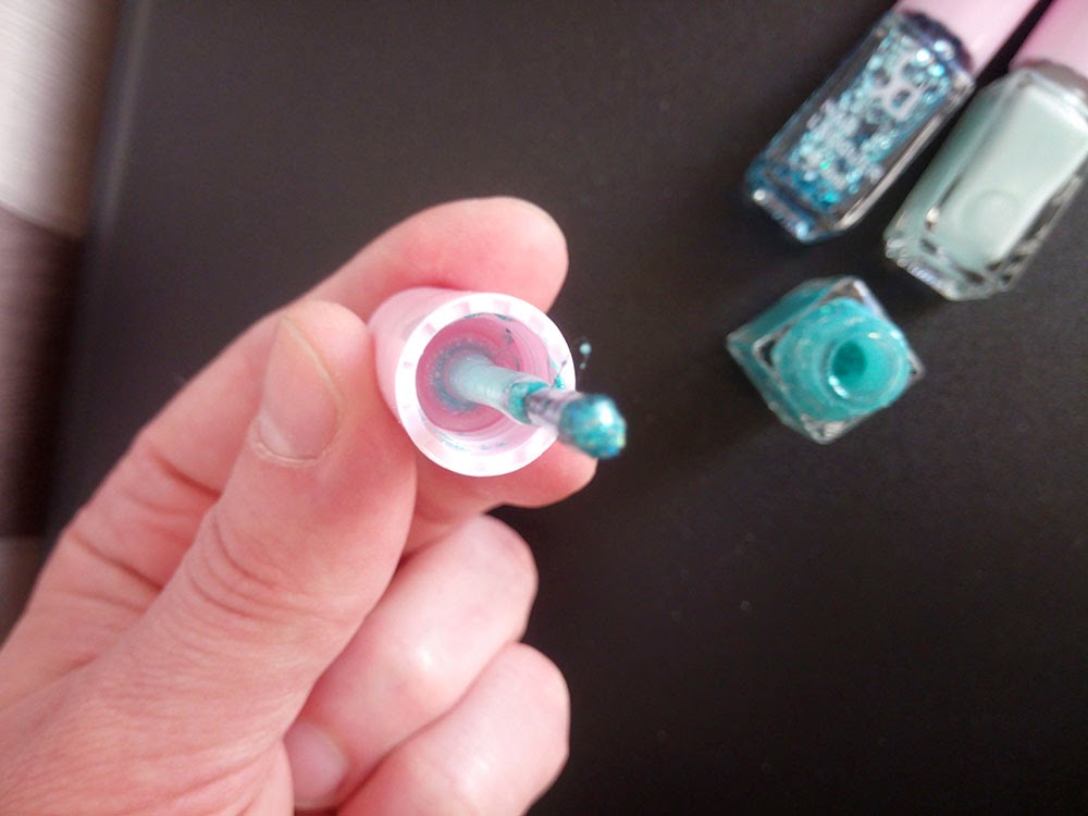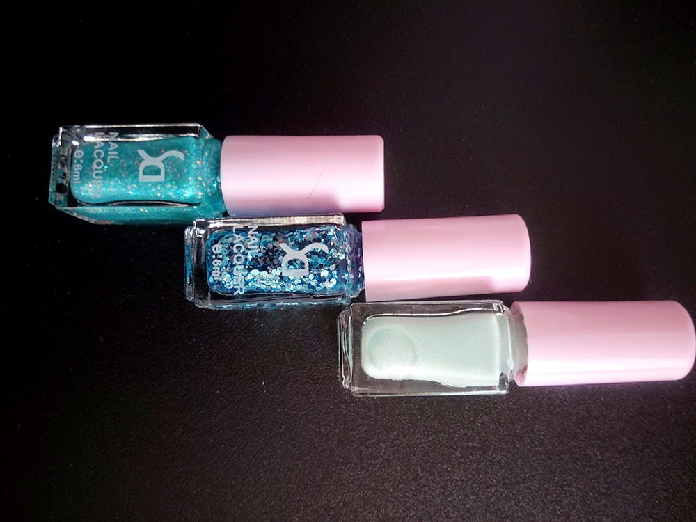 Лаки свеженькие не засохшие, кисточки нормальные. В первых двух флакончиках лак сохнет быстро,третий самый последний большие блестки чуть