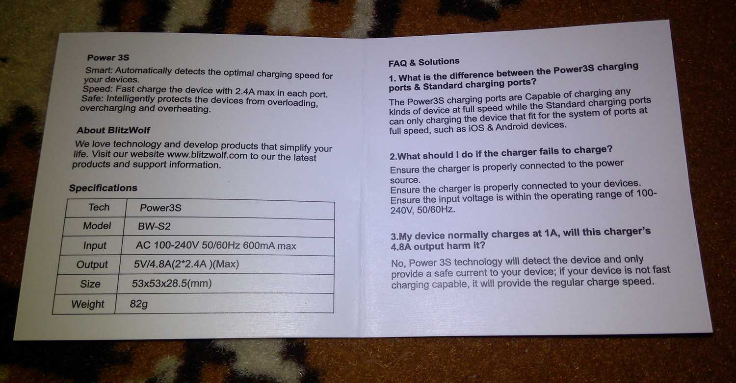 Как заявляет производитель зарядка имеет супер компактный дизайн, но как по мне размер 53х53х25 я бы не назвал супер компактным, но вполне допустим. Имеет полную совместимость со всеми мобильными устройствами и может заряжать два гаджета одновременно, что очень удобно как не крути. Как заявлено производителем зарядное устройство поддерживает технологию Power3S, а это значит что устройство может определять оптимальный зарядный ток для каждого подключенного устройства и обеспечить максимальную скорость заряда, без вреда для подключенного устройства.