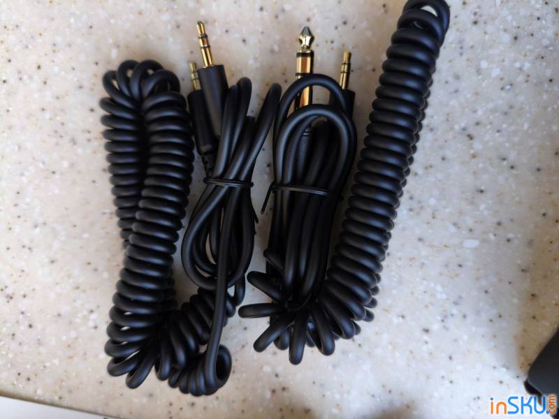 Кабель — ещё одно заметное преимущество. Это витая / спиральная конструкция: в расслабленном виде он довольно короткий и не мешает, а при растяжении вытягивается до порядка 3 метров (в зависимости от модели). Такой кабель удобен как для работы за компьютером, так и для подключения к разным устройствам — к аудиоинтерфейсу, звуковой карте или даже к плееру. В комплект входят два кабеля: один с мини-джеком 3,5 мм, другой — с переходником на 6,3 мм для студийного оборудования.