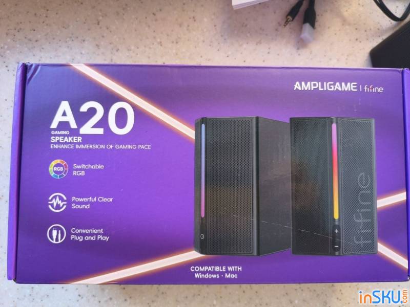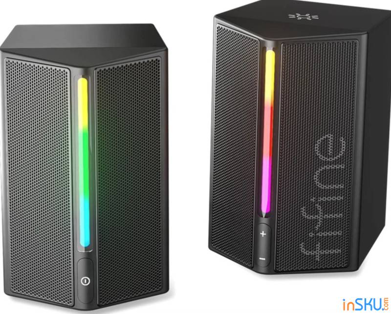 Заказывал эту акустику на AliExpress, в первую очередь из-за бренда. Fifine уже давно на слуху благодаря микрофонам, и было интересно посмотреть, как они реализовали простые игровые колонки. Внешне A20 сразу даёт понять, для кого она сделана: строгий чёрный корпус, агрессивные формы, RGB-подсветка и компактные размеры, чтобы без проблем встать на рабочий стол рядом с монитором.