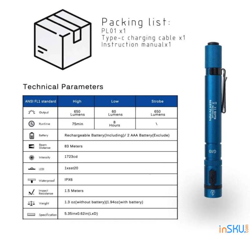 Заявленная яркость составляет 650 люмен. Для penlight-формата это неплохой показатель на бумаге. Однако важно понимать: компактный корпус накладывает ограничения на теплоотвод и стабильность высокой яркости. Такие фонари обычно рассчитаны на кратковременную работу в максимальном режиме, а не на длительное освещение больших пространств.