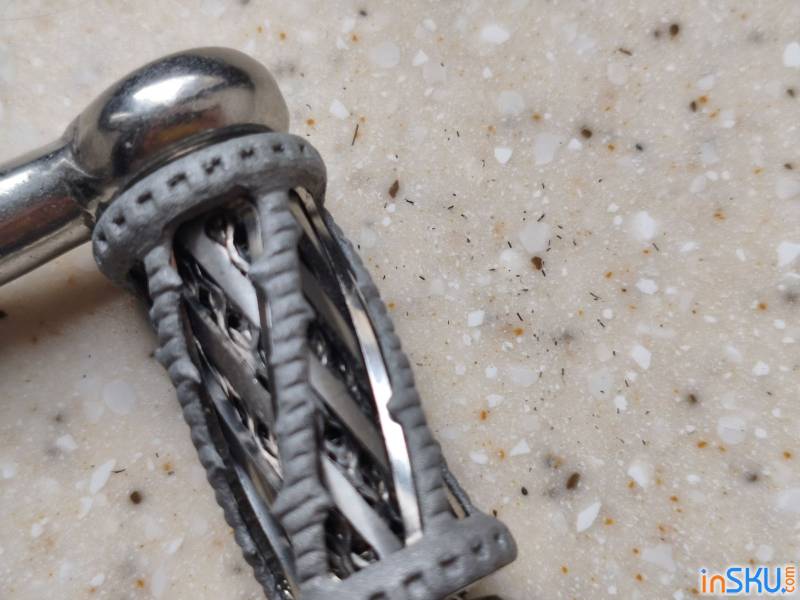 Если говорить о лезвиях, то здесь используется довольно интересная схема. В Metro установлены лезвия из хирургической нержавеющей стали, произведённые в Великобритании. Они работают вместе с внутренней частью из морской нержавеющей стали. В процессе работы происходит постепенная самозаточка — лезвия поддерживают свою остроту благодаря трению.