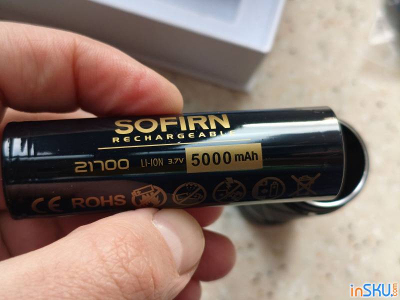 Фонарь работает от аккумулятора формата 21700 ёмкостью около 5000 мА·ч. Такой элемент питания сегодня считается одним из лучших вариантов для мощных фонарей. Он обеспечивает хорошую автономность, стабильную работу и достаточно высокую токоотдачу для питания мощных светодиодов.