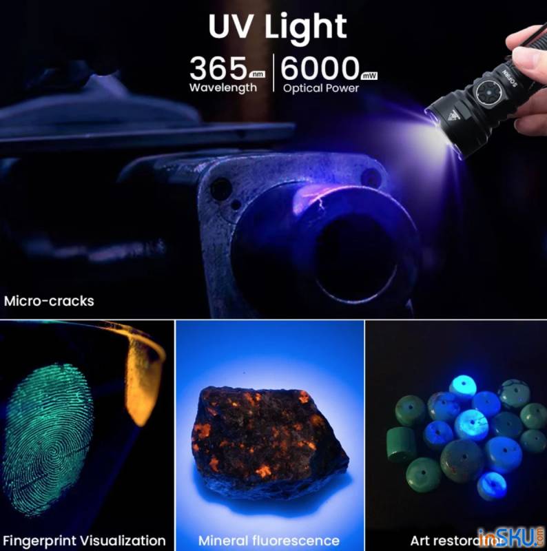 Главное достоинство модели — мощная система из четырёх диодов SST08 с длиной волны 365 нм. Такая конфигурация обеспечивает сильную флуоресценцию и позволяет работать с различными объектами: от банкнот до минералов и технических жидкостей.