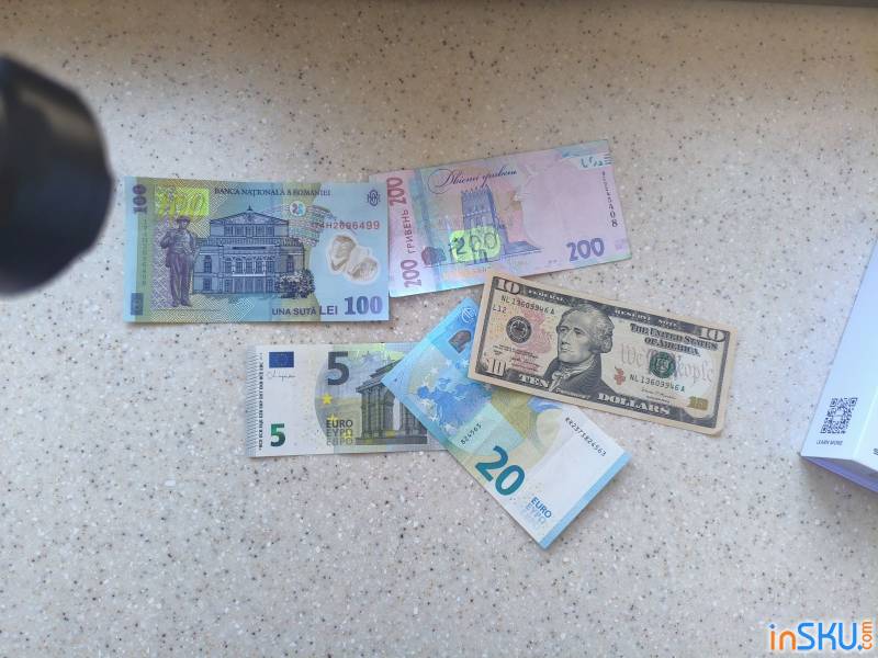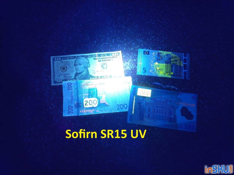 Одно из самых распространённых применений — проверка подлинности банкнот и документов. На современных купюрах присутствуют защитные элементы, которые проявляются только под ультрафиолетовым светом. С помощью SR15 их можно легко увидеть.