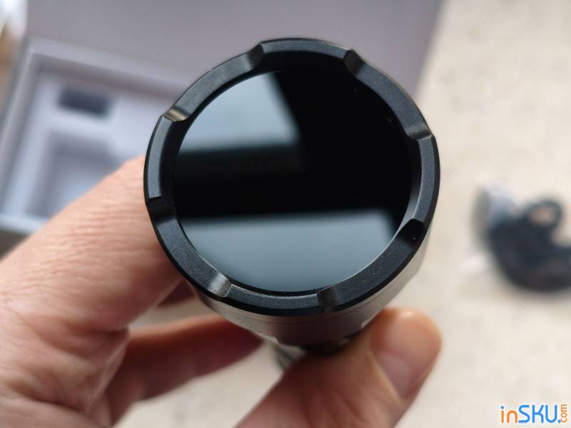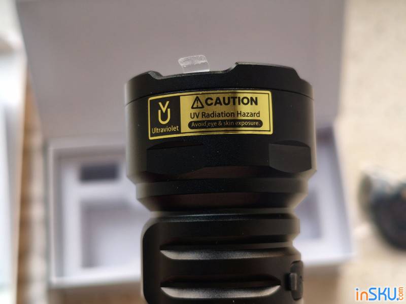 Головная часть фонаря довольно крупная — около 40 мм в диаметре. Это объясняется тем, что внутри размещены четыре ультрафиолетовых диода SST08 и соответствующая оптика. Такая конфигурация позволяет увеличить мощность излучения и сделать освещение более равномерным.